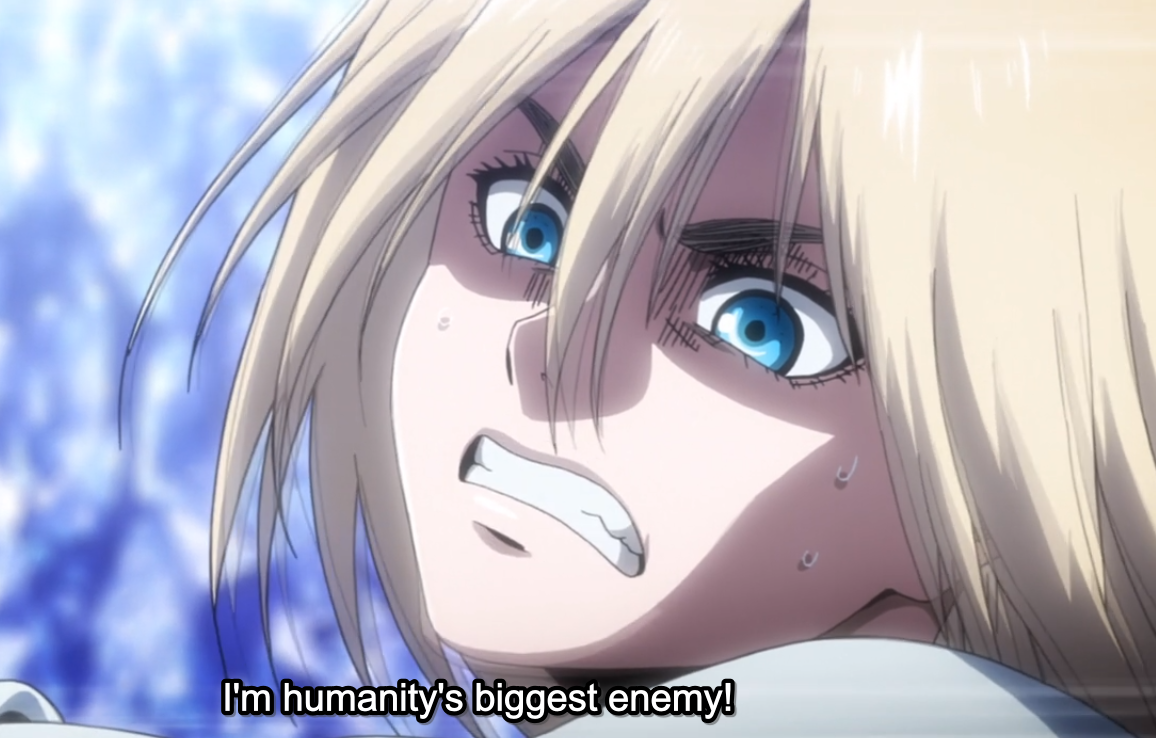To her father, she said, “God, my ass! That’s just a copout so you can manipulate other people. I’ve had it! I won’t let you kill me.” And to Eren, who whines about not being able to die when it could save humanity, Historia said, “Exterminate the Titans? Who the hell wants that bullshit?! If anything, I’m starting to hate humanity! Let them get wiped out by Titans! I am humanity’s greatest enemy! Do you get it? I’m the worst girl who ever lived!”