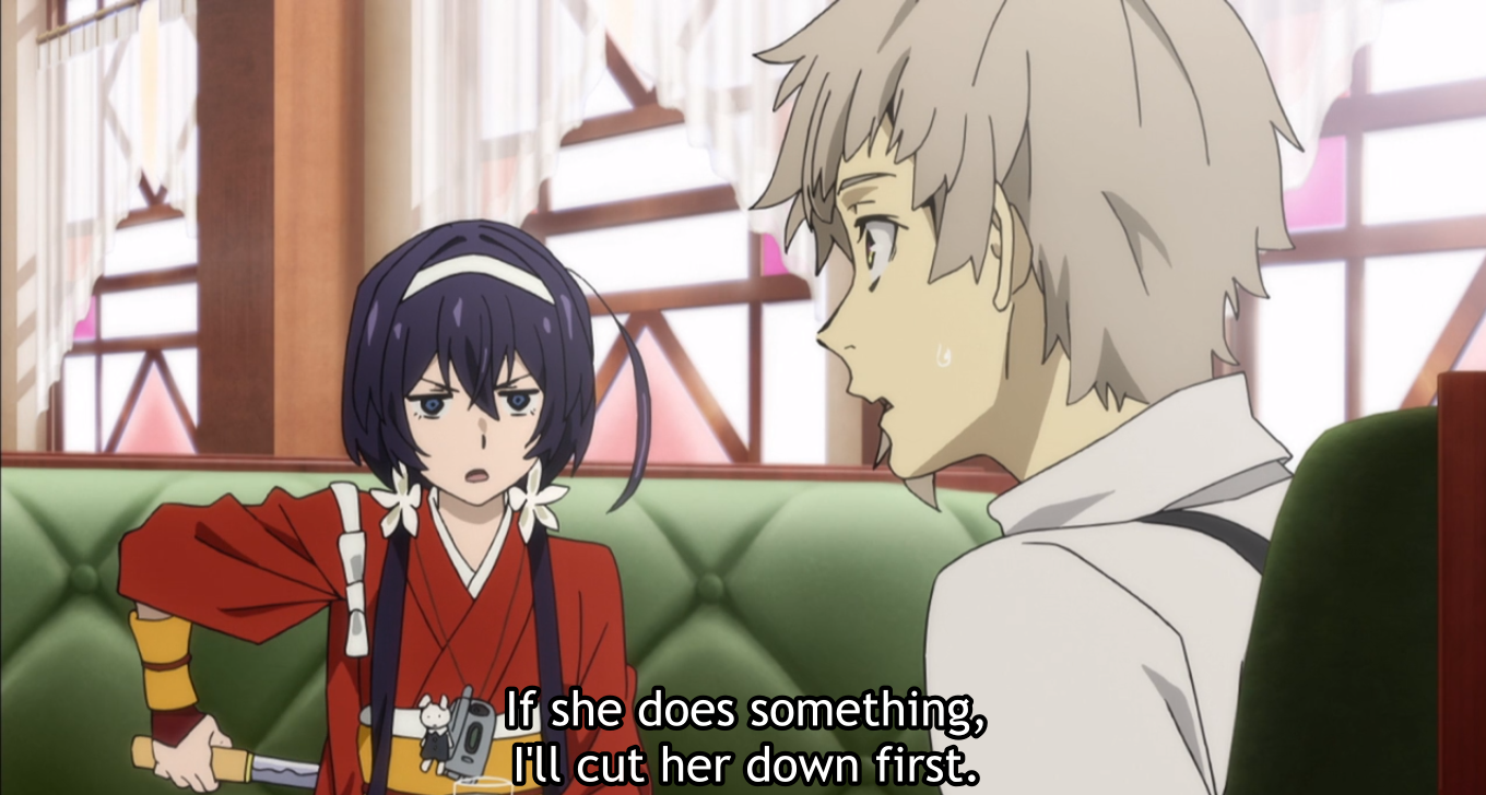 Kyouka is back, and as scary and cute as ever! Lucy seems to like Atsushi and is mad at him because he didn’t come to see after the Moby Dick landed in season 2. Atsushi obviously likes Kyouka, so I believe we have a love triangle here. Rampo and Tanizaki (Junichirou) made brief appearances, but nothing much from Kinukida or the Port Mafia. Ango the informant from the government also showed up for a bit.