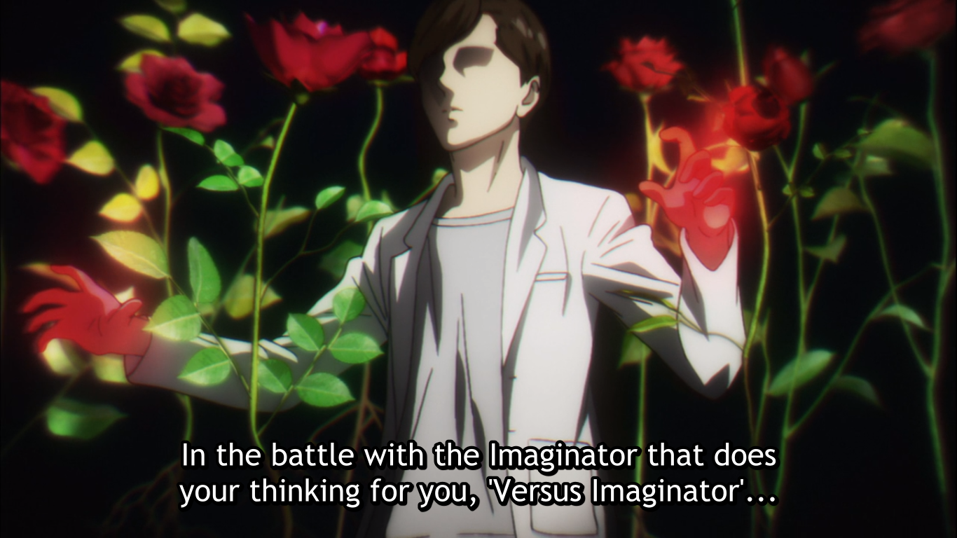 Episode 4 shows the story of Jin Asukai and how he begins to use his special ability after meeting the Imaginator. She shows him the possibility of using his power to modify human hearts, which at first he rejects. Imaginator manipulates Asukai into changing his mind, possessing and killing a drug-addled former student, and encouraging him to tamper with the student’s dying heart.