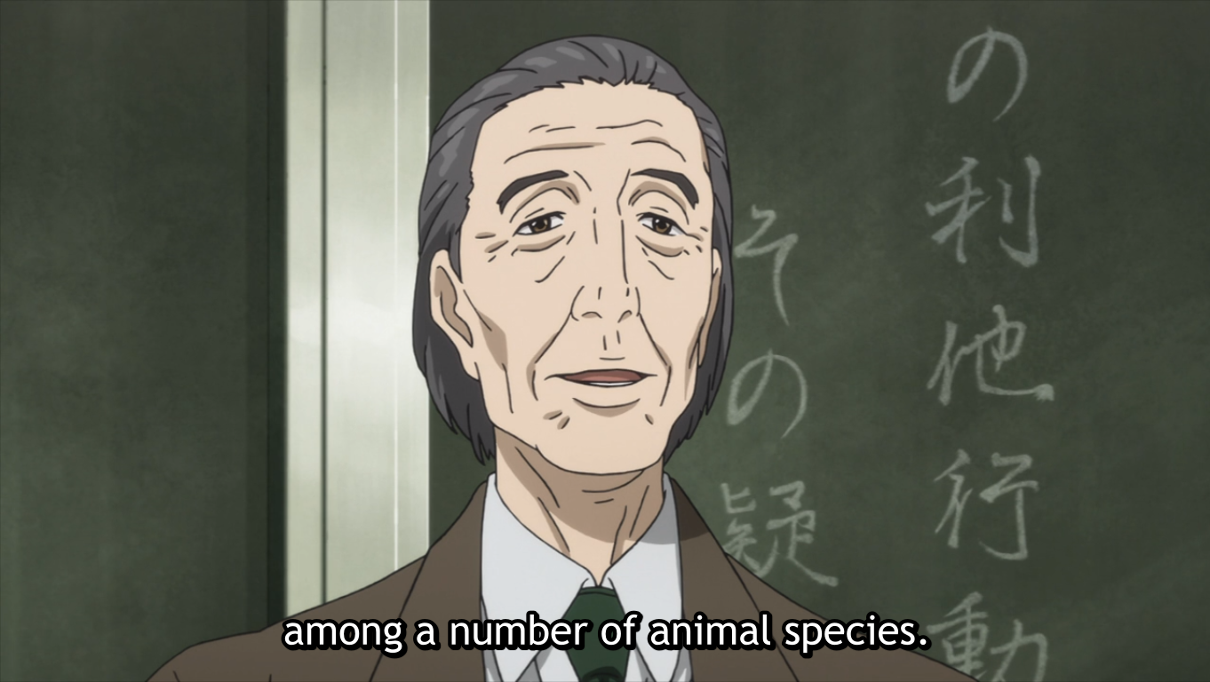 Then there’s the example in episode 14, the Selfish Gene. The episode is named after the famous science and literary work of the same name by Richard Dawkins. Reiko the Parasyte is attending University lectures to learn more about biology, genetics, and humans. The professor who is lecturing says the following about altruism, nonhuman animals, and humans.