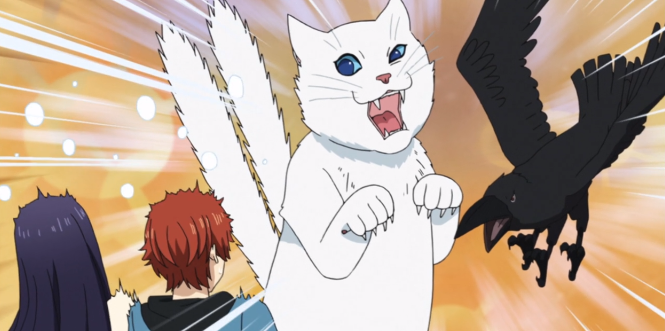 In the middle of the episode, there’s a fun scene where the crow spirit Kuro (meaning black) scuffles with Yuki the cat-like youkai. The humor of the scene got a good grin out of me. I live in a neighborhood with a ton of cats, and while we have a few small and pretty songbirds, there are mostly birds like crows, jays, mockingbirds, and grackels, which can all be pretty noisy and prone to fighting. I see cats, squirrels, and birds fighting in the mornings fairly often. It can be funny. But when it’s two supposedly noble, ancient youkai fighting like common city animals, pretending it’s dignified, it’s damn hilarious.