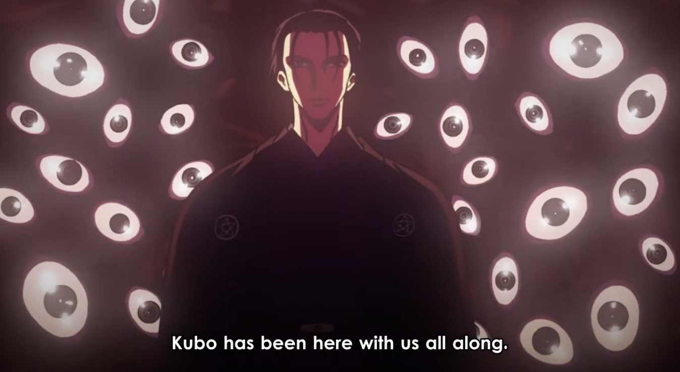 On several occasions in episodes 2 and 3, Kiba compares himself to an empty box. He feels like he has no real purpose. When it became clear that Yoko was troubled, and after seeing the message from “the demon” in episode 3, Kiba thinks his box has been filled because he has people to protect (Yoko and Kanako) and an enemy to hunt down. In episode 4, after being called off the case of the vanishing Kananko, Kiba remarks that he is now a broken box. There are many other examples as the series progresses. We see more of the Onbaka-sama Priest in eps 6 and 10, and his religion fears and worships boxes. Toriguchi in episod 6 tells the story of “the man possessed by boxes,” who turned out to be Suzuki from Dr. Mimasaka’s facility.