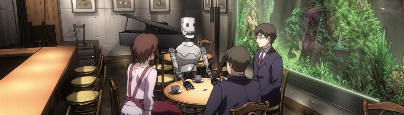 Roughly based on a manga by Yasuhiro Yoshiura, Eve no Jikan is an ONA series of six episodes, 18 minutes each. Later, it was adapted into a movie. Genres include sci-fi, slice of life, and psychological. The setting is a not-so-distant future where robots/androids are used by most people, for labor in business, and in the household as servants. Society is strict about separating androids and humans, but there is at least one secret coffee shop where robots and people are treated exactly the same, and nobody reveals which they are. That cafe is called Time of Eve. Male MCs Rikuo and Masaki visit there, having several interesting and thought-provoking interactions with both people and robots.