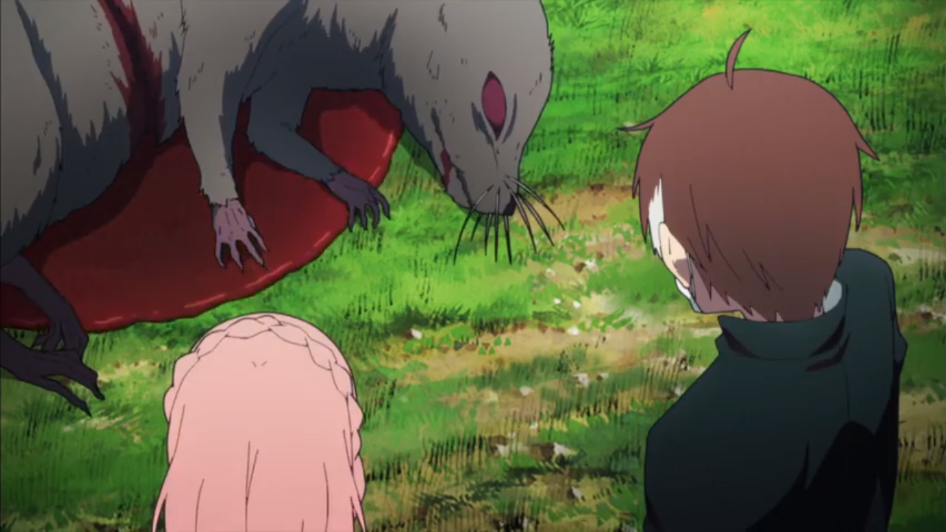 It’s unclear what this game is about. At first, the one responsible for kidnapping (an absurd character named “Paka” in an alpaca mask) says they’ll need to fight gigantic animals, whose existence no one questions. We’re talking about rats bigger than humans. Then, for some reason, four of the kids play Kokkuri (with a real and very dangerous spirit, of course), while the other four… just wait around, I guess?