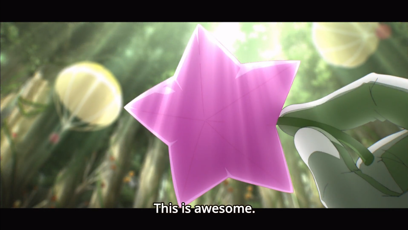 Ok so then how about the way this episode looked and sounded? The music in this episode was enjoyable, again I noticed it was very orchestral in style. The opening and ending songs are fine, but don’t really stick out at me much. It’s nice to hear Hosoya Yoshimasu playing Kanata and Shimazaki Nobunaga playing Cherce. I like the art style of the characters, and I think the scenery, backgrounds, and creatures of this planet looked very good. I have a terrible eye for art, but this seems pretty decent in my often-dead-wrong opinion.