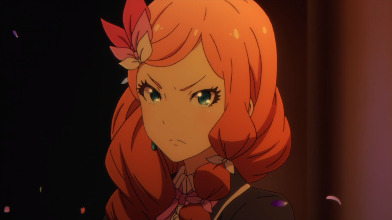 Which brings me to the next item: I love the visuals in Granbelm. The scene with the flowers in the courtyard made my eyes widen and my mouth hang open for a few seconds, and there were several exclamations of “holy shit” and “jesus motherfucking mary.” But the flowers aren’t all. I love everything so far about the visuals. The lighting and shading. The quaint and unpretentious backgrounds. The mechs and magic in episode one. The cute, pretty character designs. And the colors used, both in “normal” scenes and in Magiconatus.