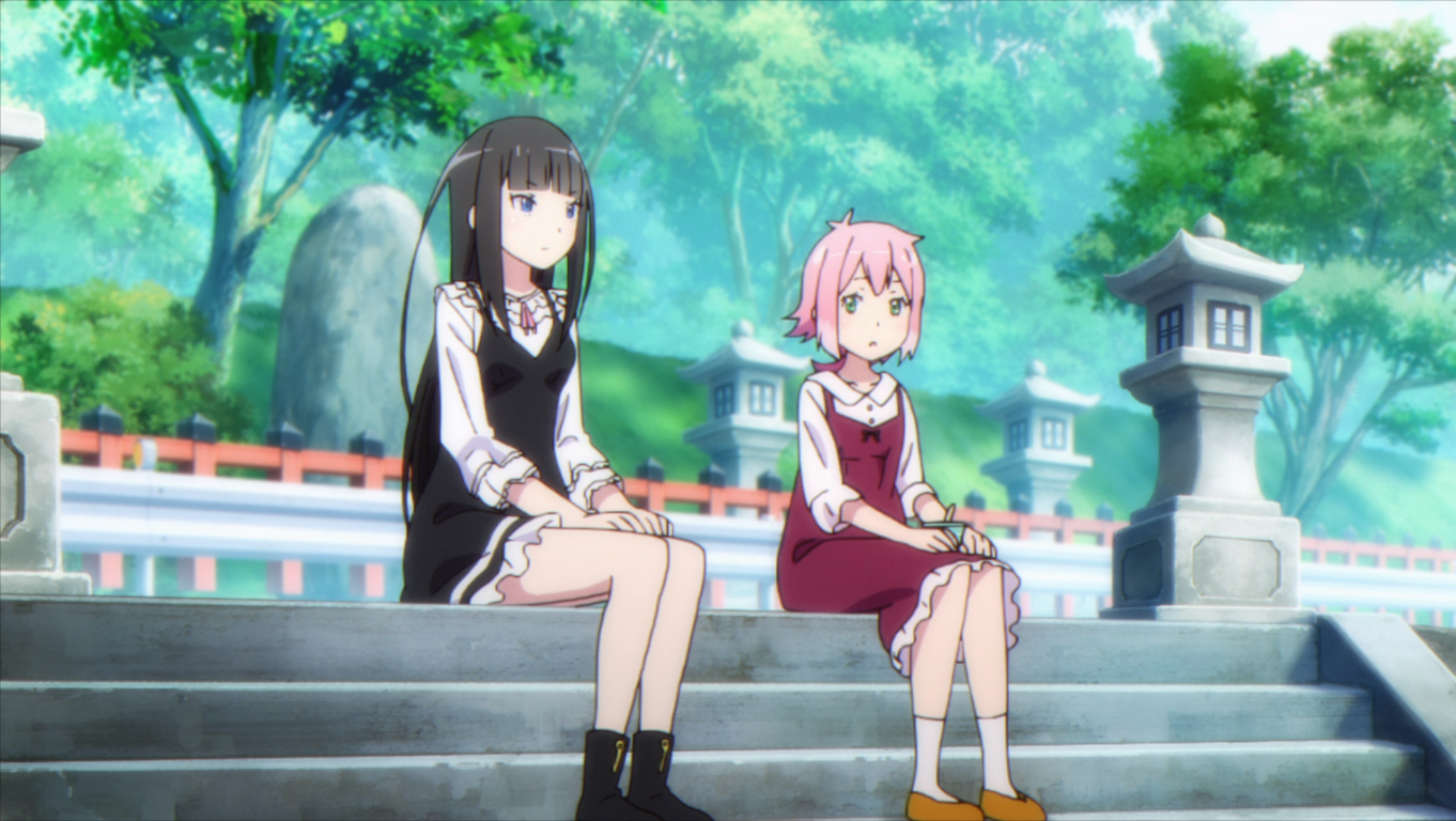 Granbelm features voice actresses I like and that I’m coming to like even more! I vaguely recognized one or two of them before, but not enough to put a name on the voice. Now that ANN has some cast listing, though, I know! Atsumi Tanezaki is Shingetsu. I know her best as Futaba from Seishun Buta Yarou. Miyuri Shimabukuro is Mangetsu. I know her from being Carole in Carole and Tuesday. Also, Anna Fudo is voiced by Yoko Hikasa. With regards to audio, voices aren’t the only thing to love. The opening song, “Tsuki wo Ou Mayonaka,” is inspiring, exciting, and addictive! “Negai,” the ED, is gorgeous! In addition, I’m enjoying the instrumental music. Listen to the piece that plays when Mangetsu turns the school courtyard into a field of flowers!