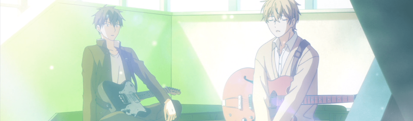 Given episode 1 showed us the main characters, Mafuyu and Ritsuka. The former is spacey as can be, and also cute as a button. He carries around a guitar for some reason, but doesn’t know how to play. Ritsuka is excellent at guitar but feels disinterested. Still, he has a casual band with two other guys, Kaji and Haruki. Mafuyu begs to be taught how to play, but Ritsuka refuses to teach him. Thanks to Kaji and Nakayama, Mafuyu learns to restring and tune his guitar. Encouraged, he continues to pester Ritsuka about teaching him.