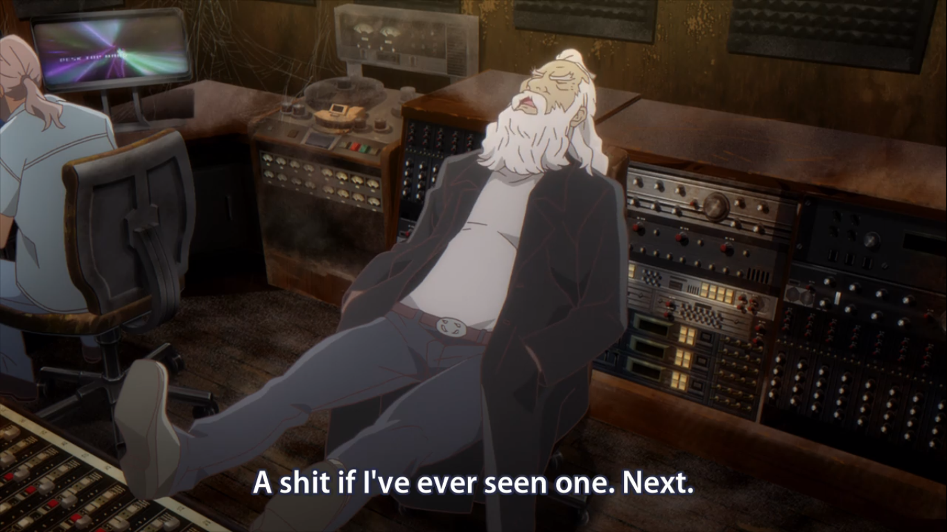 I felt disappointed that nothing was said or shown about Gus’ potential relationship with Flora. In fact, Flora wasn’t even mentioned. I assume she found a place to stay? Maybe she went to rehab. Tobe, the bad-tempered producer who calls everything shit, reappeared in this episode, much to my amusement. I’d hate to work with him in reality, but types like him are hilarious in anime. Because of Tobe’s strict standards, Carole and Tuesday only got him to approve one of their songs for recording. They had been hoping to record a whole album.