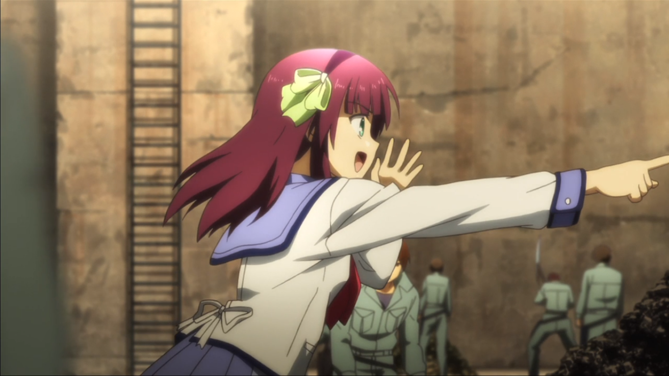 Yuri isn’t opposed to letting her followers “die” in order to get through the traps and reach the Guild in ep 2. Of course, anyone who “dies” revives later in the school infirmary, but they still experience pain and fear. She is willing to accept the sacrifices offered by the others without hesitation. But Yuri isn’t heartless enough to force Otonashi to let go of her and fall when they’re hanging off the cliff; she lets him climb up over her and then pull her up. Angel followed the battlefront underground, so Yuri had the wild idea of blowing up the Guild and moving the weapons base to another location. This way, Angel can’t reach them. She’d be blasted by explosions. She might survive and remain trapped under rubble for a while. Or she might “die” and take time to revive, giving Yuri and company time to relocate secretly.