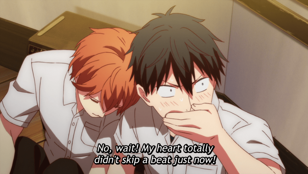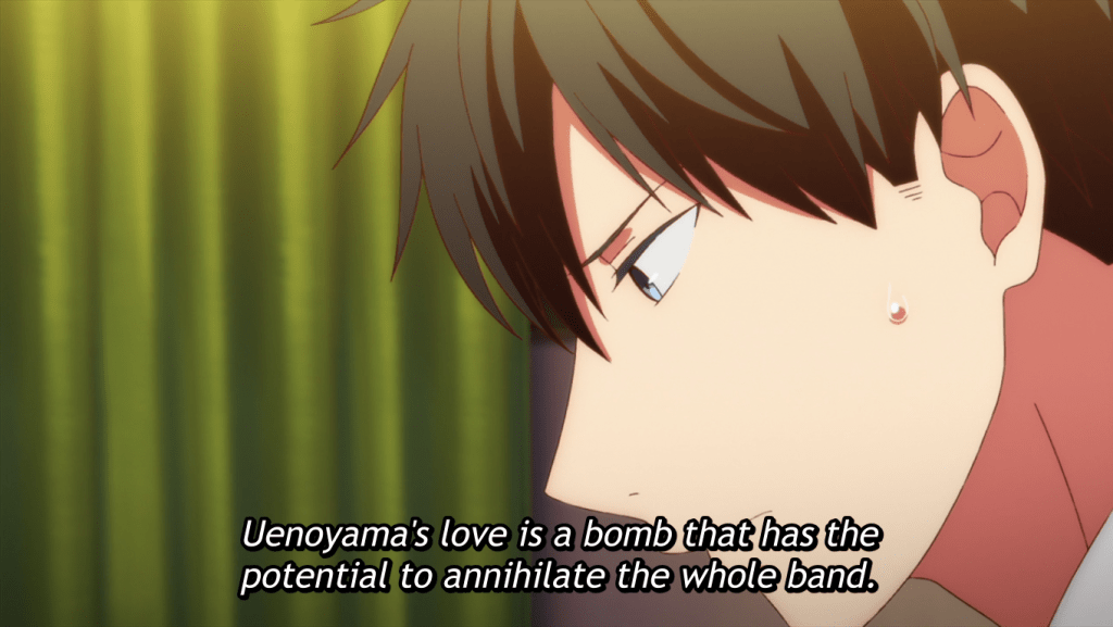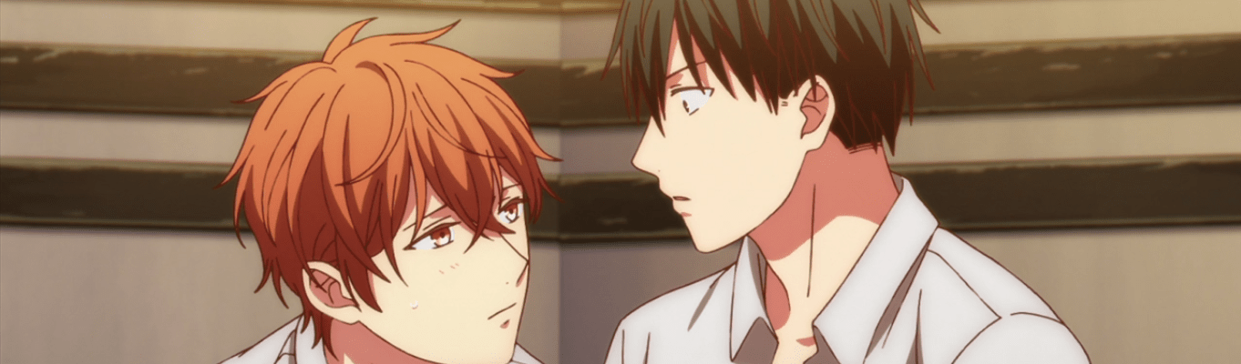 Mafuyu is still having trouble thinking of lyrics for the song. Ue is having problems being supportive of Mafuyu because he’s jealous that Mafuyu is writing a song about being in love with someone else. Akihiko and Haruki tried to call out the younger boys on these issues, but is that enough to resolve everything by the time they play their concert? At any rate, let’s move on to episode 8.