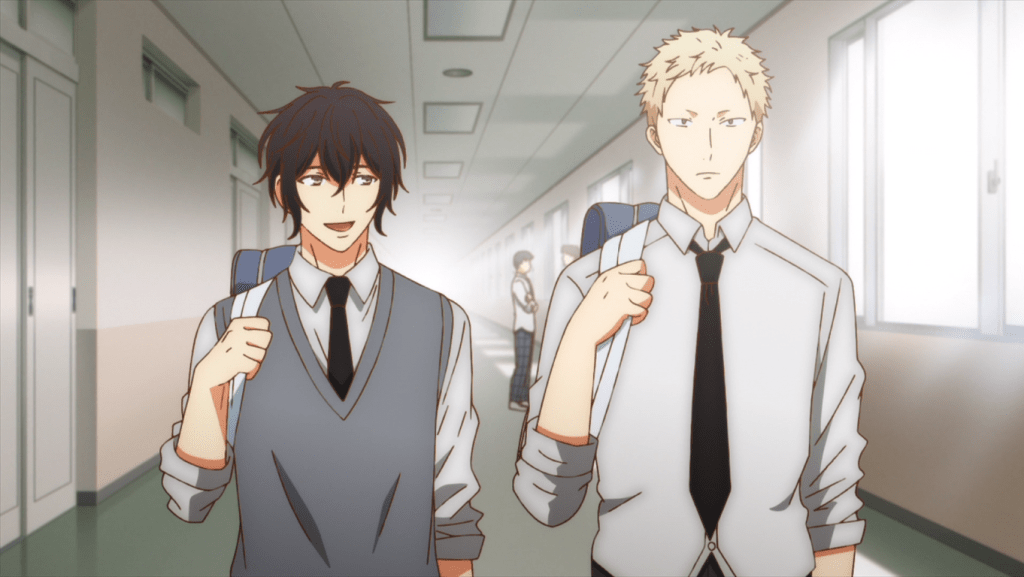 Almost right away we have an excellent moment of talking about sexuality as Akihiko talks to Ue about him being in love with Mafuyu. Kudos to this anime for making a point of saying there is nothing wrong with guys liking other guys. In addition to that, the conversation was kind of funny and just really cute.