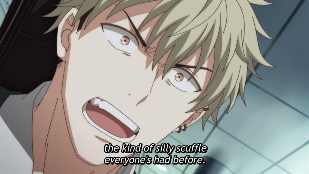 I know it’s a romance/drama, so it’s only natural, but things sure are dramatic in this anime. Like Akihiko’s description of love. He says, “Falling in love with someone is something much more violent, like having your flesh ripped apart.” Is it really that intense for some people? Well, nevermind. It was that intense and dramatic for me, too, when I was highschool aged and in undergrad. It’s just that I generally try to forget that stuff.