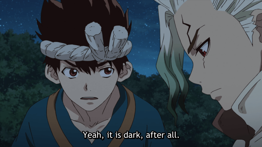 In episode 8 of Dr. Stone, Senku and company succeed in making magnets, a generator, and an electric light. Before using the light, Senku asks Chrome if he’s afraid of the night. Chrome replies, “Yes. It’s dark, after all.” His readiness to admit that and lack of any shame for it was a pleasant surprise, and sort of refreshing. It’s what made me start on that rant.