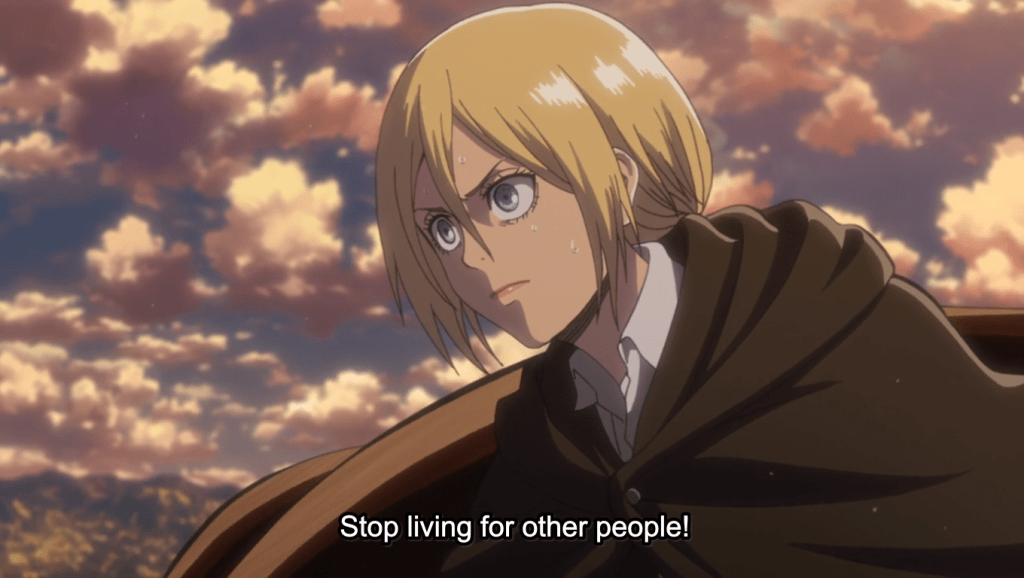 The strong element of romance in this season is unique among all the other arcs of Attack on Titan (at least, up to chapter 118 in the manga, which is as far as I’ve read). Of course I mean the romance of Ymir and Historia, because you can’t really call it anything else but love. Related to that, there’s a powerful theme of this season that I really love: don’t live your life for other people. Live for yourself. Within reason, and the bounds of pro-social behavior, I wholeheartedly agree.