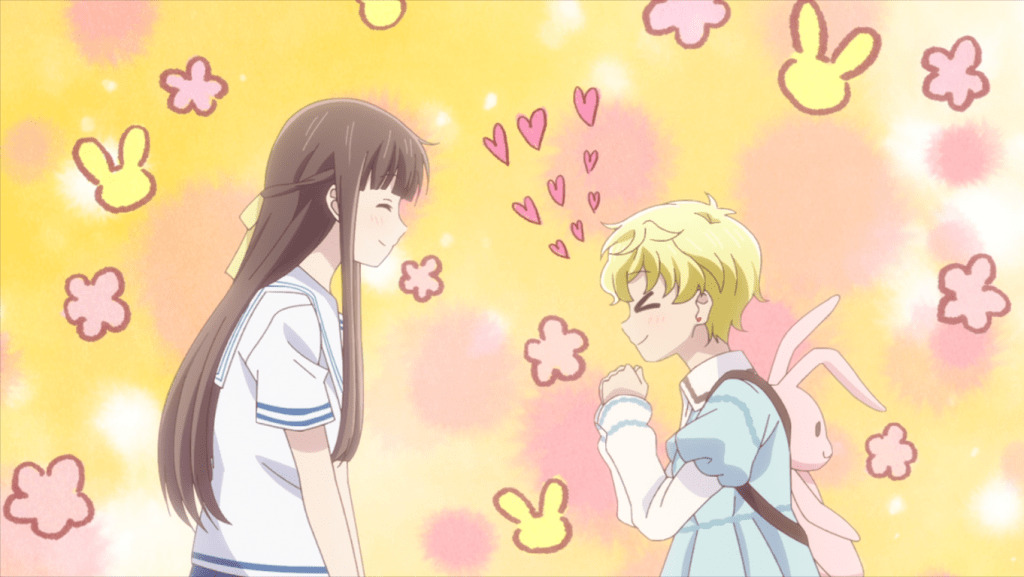 The visuals are typical of modern slice-of-life and Shoujo anime, but slightly more detailed and polished, generally. In these episodes, I noticed a lot more of the comedic, cartoonish style with simplified character art and expressions. That does get slightly annoying to me at times, as do the prolonged shots of happy moments with bubbles and sparkles. Mostly, though, these elements help contribute to Fruits Basket’s particular aesthetic.
