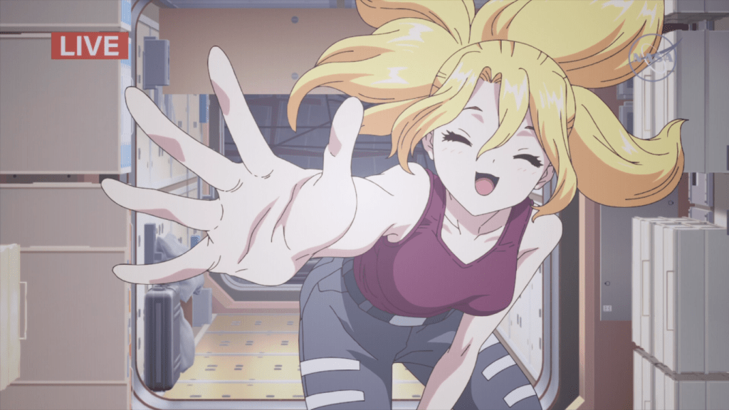 This new direction and new information revived my interest in Dr. Stone. The story of the astronauts was actually strikingly well-done. It managed to pull me in and make me care about those 6 characters in only twenty minutes. Much of it was due to the great voice-acting, with seiyuu such as Keiji Fujiwara (Byakuya) and Rei Tanaka (Darya). I thought I’d be more annoyed with the fact that they got an English singer to do the songs of Lilian, but actually it worked out well. The songs were entertaining and emotional, and there wasn’t a huge difference in the range of voice between Lilian and the English singer.