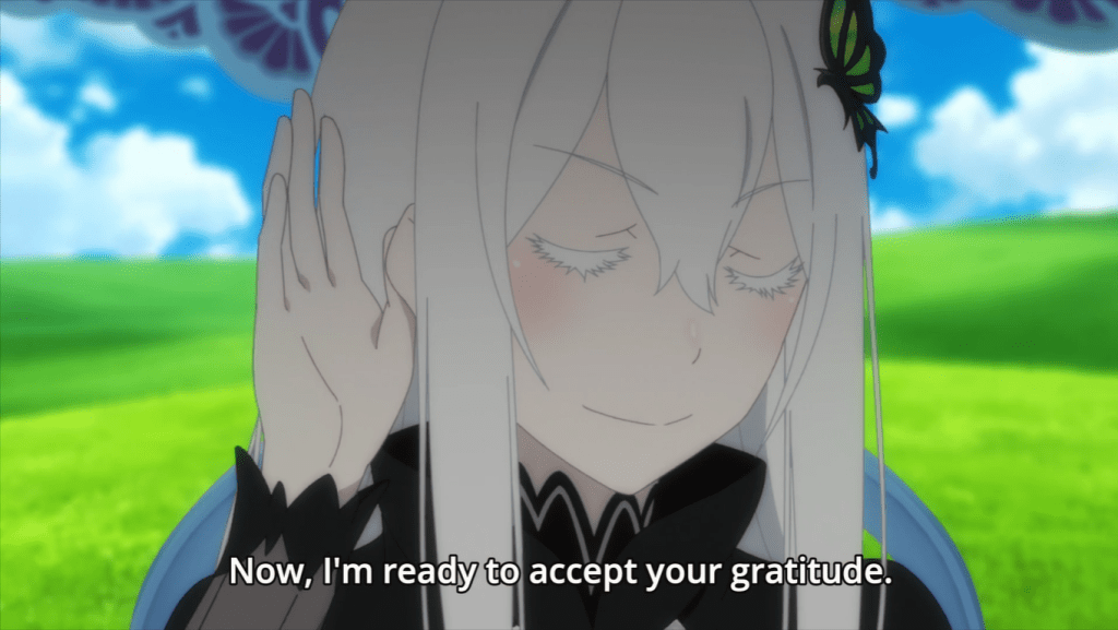 Even with the stabilizing effect, Subaru breaks down as he tries to tell Echidna about his ability to die and restart. The knowledge does not harm Echidna as it did with Emilia in a previous world. Much to my surprise, the episode reveals that Echidna already knew Subaru’s ability, and had watched him from her world all along. Now instead of watching, she’s actually helping.