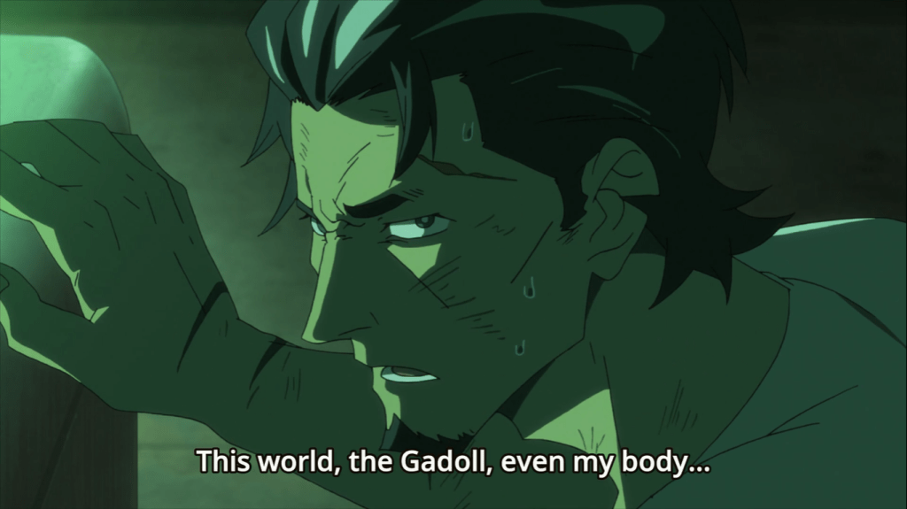 The final scene of the episode is intense. Kaburagi is wounded, but he and Natsume escape from Hugin for now. In the control room, they active the Gadoll Genocide System, and all the Gadoll inside and outside Deca-Dence start dying. This is when it all hits Natsume. This isn’t a nest; it’s a factory. She asks what the hell is going on, and Kaburagi tells her the world she knows is manufactured. I wonder how Natsume will handle it. The episode ends here.