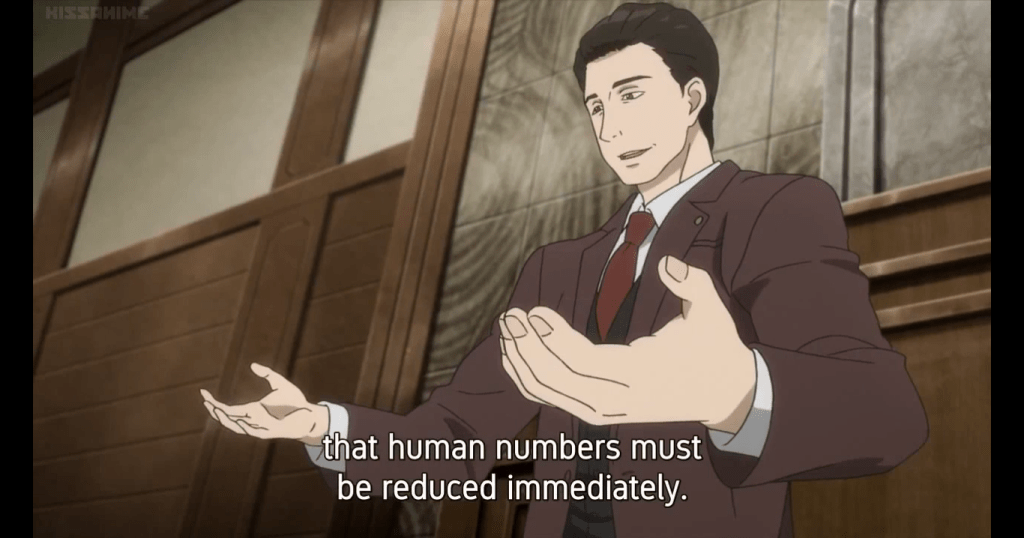 Hirokawa is the individual who becomes mayor of Shinichi’s town and stands in support of Parasytes. Indeed, he may be one himself. This man is extremely interesting to me, and I wish he had gotten just a few more scenes and lines to strengthen his character. Long story short, he’s a radical environmentalist who wants to enforce population control of humans for the sake of greater biodiversity.