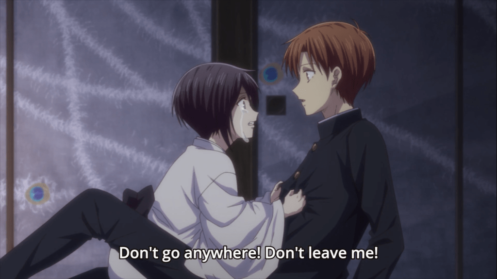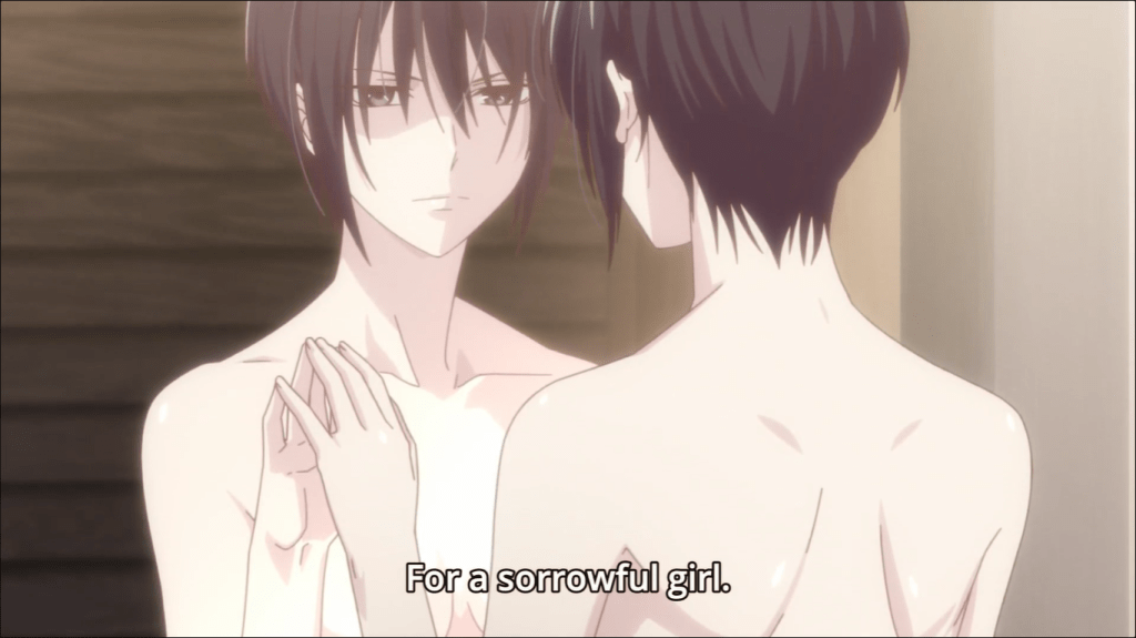 Back in the present, Tohru can tell Kureno is losing his cool. He says he won’t meet with Arisa ever again, but tears come to his eyes as he says it. Kureno’s overwhelming inner conflict becomes clear to the audience as well as to Tohru and the man himself. He wants to see Arisa and indeed feels like he has fallen for her. However, even now, he cannot abandon Akito. I really felt for this character and his dilemma. Kureno restates to Tohru that he could never leave Akito, that fragile and sorrowful girl.