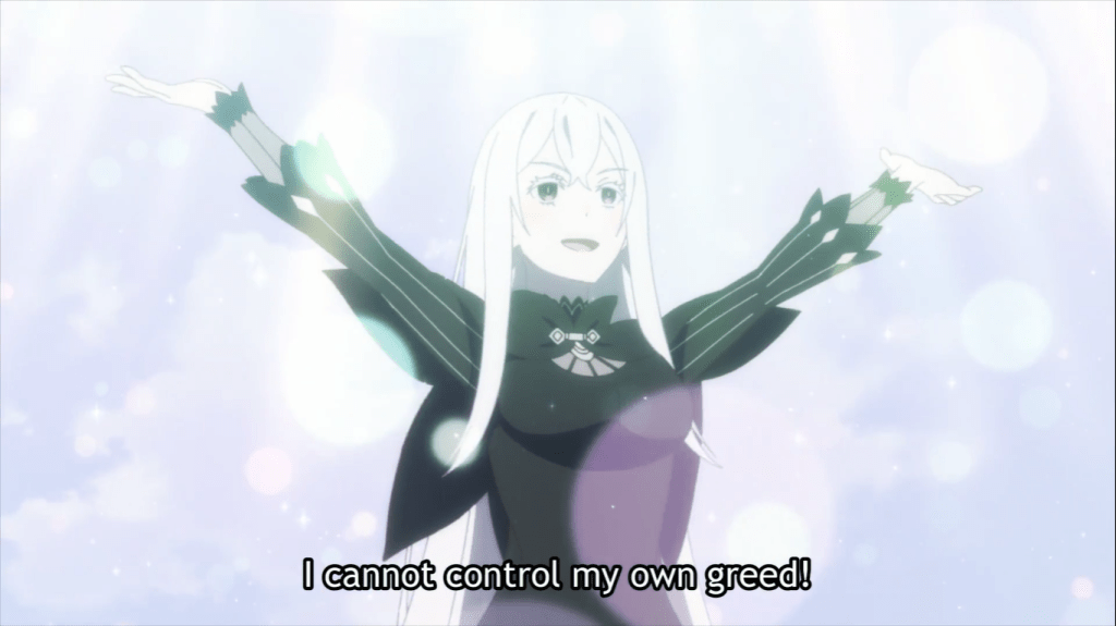 The Witch of Greed explains that she created the fake Rem scenario to pull Subaru out of the second trial, which would have destroyed his sanity. Echidna then proposes the idea of making a magical contract with Subaru. She would offer her aid and knowledge to him whenever he was stuck in a loop he couldn’t fix. It sounds like a good deal, but Subaru didn’t bother to ask what the payment would be.