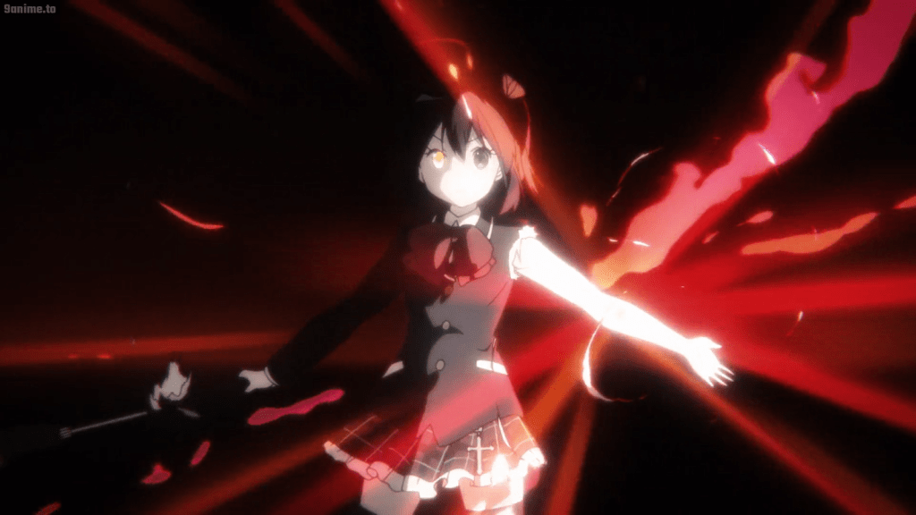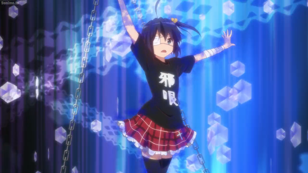 This anime follows Yuuta as he befriends Rikka, a girl with an alarmingly serious case of chunibyo. She believes she has dark powers and a magical “Evil Eye” which is to be used to find “The Unseen Horizon.” As he bonds with new friends, Yuuta grows closer to Rikka and learns there is more to her than meets the eye. Chunibyo falls into the genres of comedy, romance, and school. It does a good job of getting your attention right away and holding it decently through the series. The plot isn’t especially structured, being more slice-of-life, but it works well enough. The writing and progression of events within each episode impresses me more than the arrangement of the episodes in a broader sense.