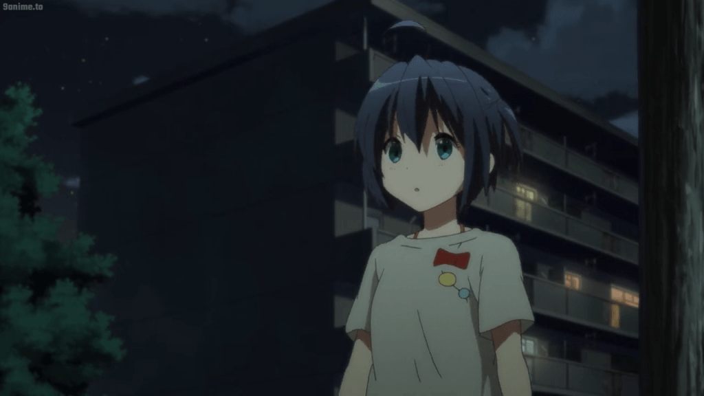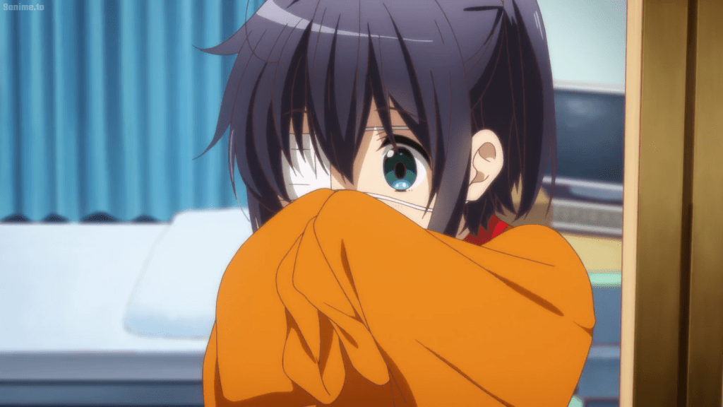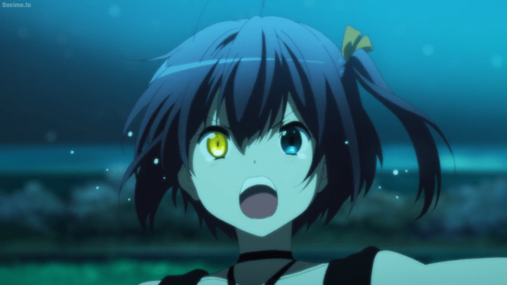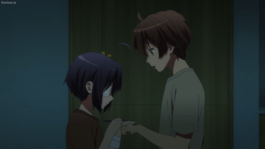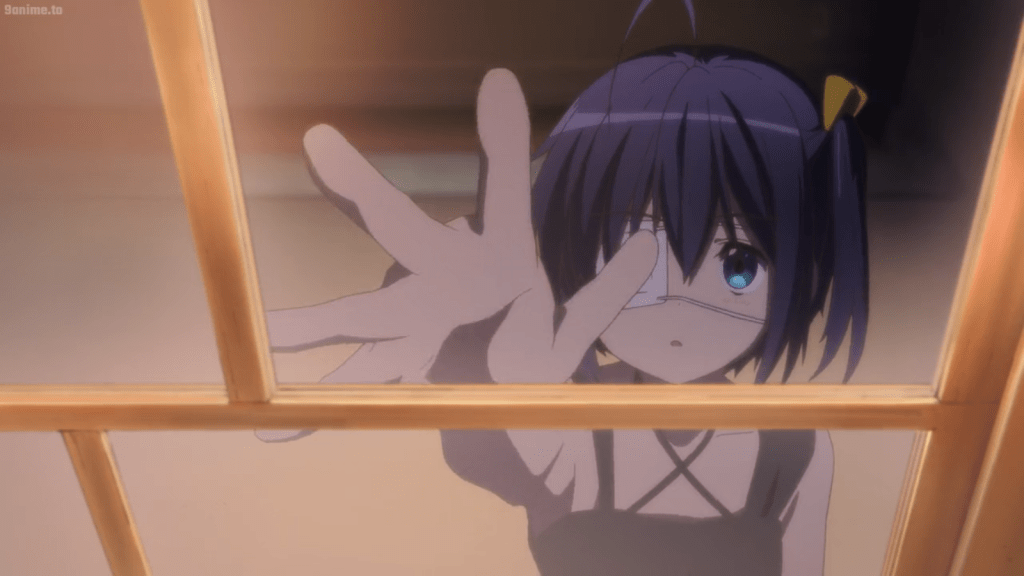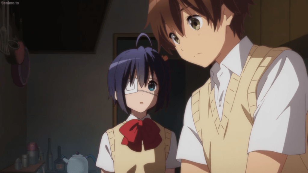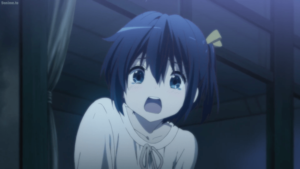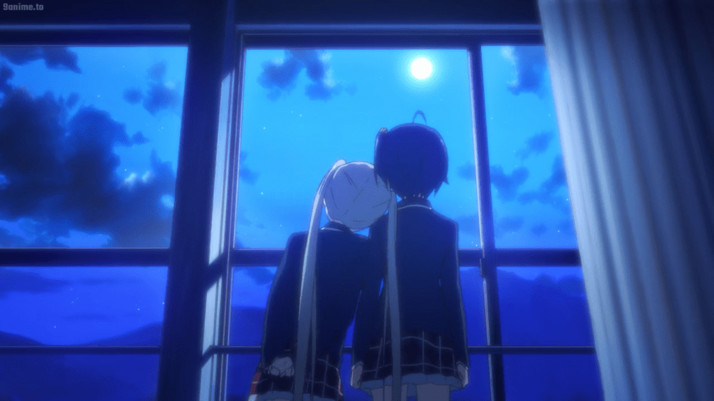 All of the aspects discussed above were enjoyable in Chunibyo. The show is cute, funny, and well-made. The visuals for this anime and the character designs were always fun and pretty to behold. Let me think of a few specifics to mention. Rikka is just completely precious– absrdly adorable– and I love it. In episode 8, she is especially cute when she stays at Yuuta’s house and begins to fall in love. The scene in episode 9 where Yuuta saves Rikka from falling off the roof is one of my favorites. That hug is so sweet and genuine.