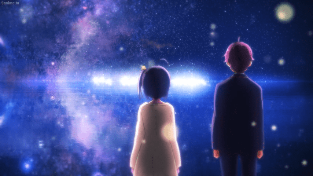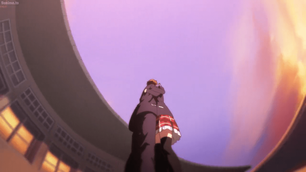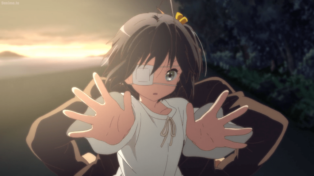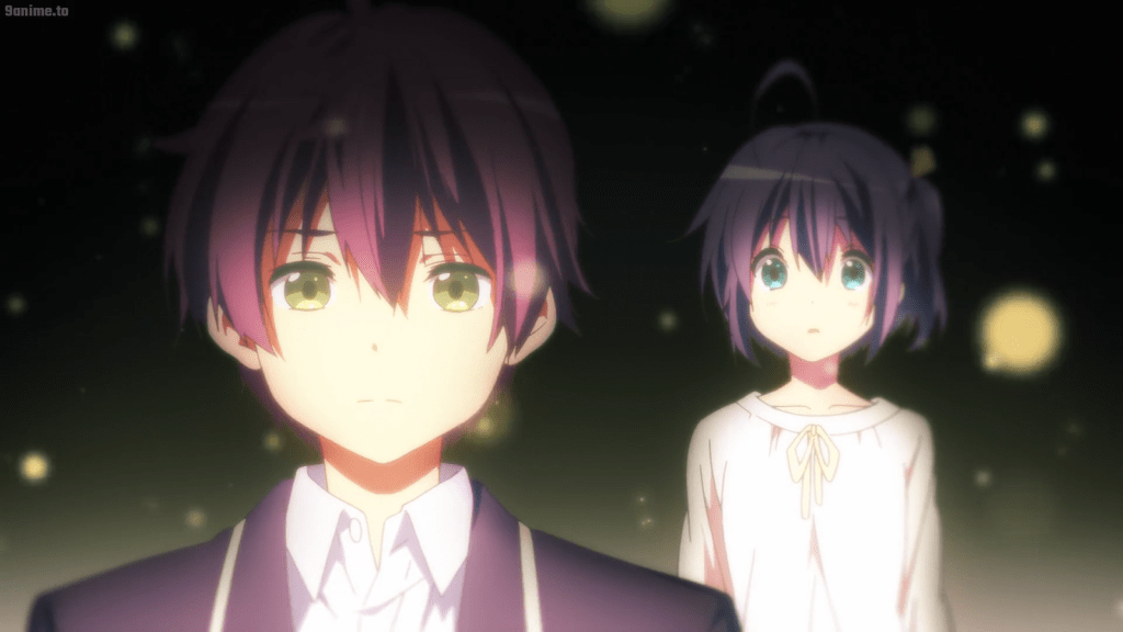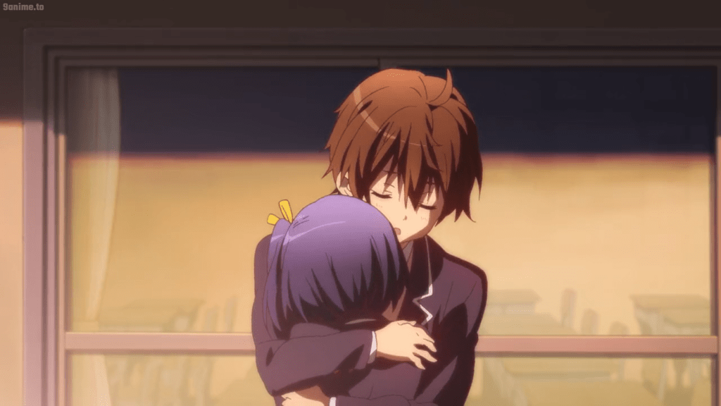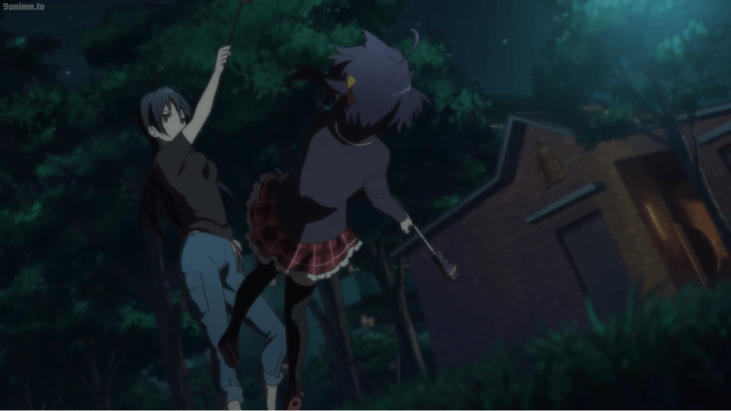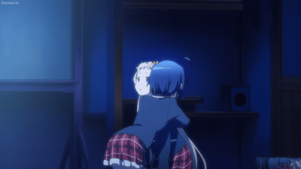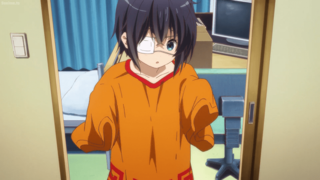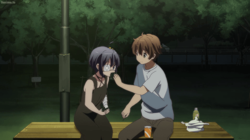 All of the aspects discussed above were enjoyable in Chunibyo. The show is cute, funny, and well-made. The visuals for this anime and the character designs were always fun and pretty to behold. Let me think of a few specifics to mention. Rikka is just completely precious– absrdly adorable– and I love it. In episode 8, she is especially cute when she stays at Yuuta’s house and begins to fall in love. The scene in episode 9 where Yuuta saves Rikka from falling off the roof is one of my favorites. That hug is so sweet and genuine.