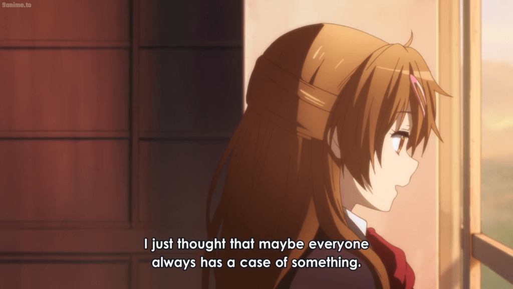 The characters in Chunibyo are well-written, relatable, and rather novel. Rikka’s character is developed in a masterful way. At first, you think she’s just extremely mentally immature, as well as a bit annoying. However, there are deep reasons for her middle-school syndrome. Her personality is unusual and endearing. I felt very touched by Rikka’s emotional character arc and its beautiful conclusion. I don’t want to spoil the main reveals here, so watch it yourself!