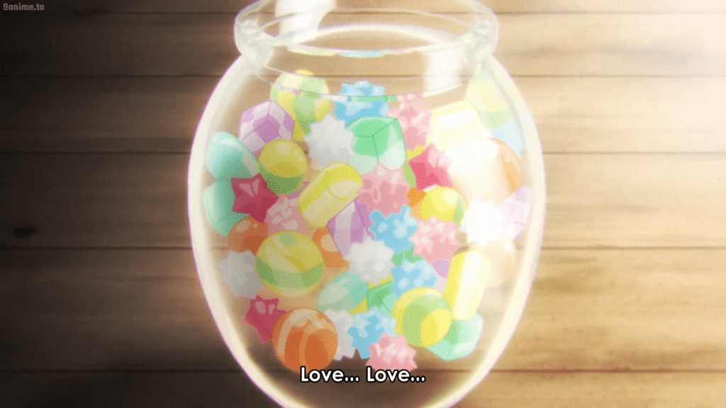 Though simple, the black and white static appearing at “bitter” moments was a good effect. I also love the consistent imagery of a jar representing a person’s heart and candy representing love. There are several other instances of solid visual imagery, such as Shoko being the metaphorical canary. Finally, it’s worth noting that the shots and angles throughout HSL are fairly diverse and creative. The art and animation definitely leave some things to be desired, but they are by no means poor.