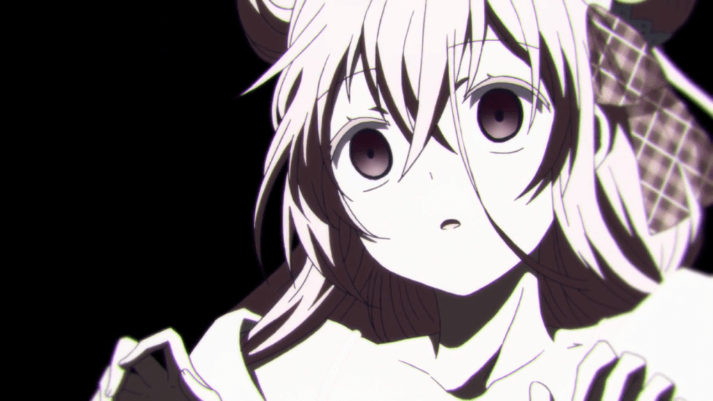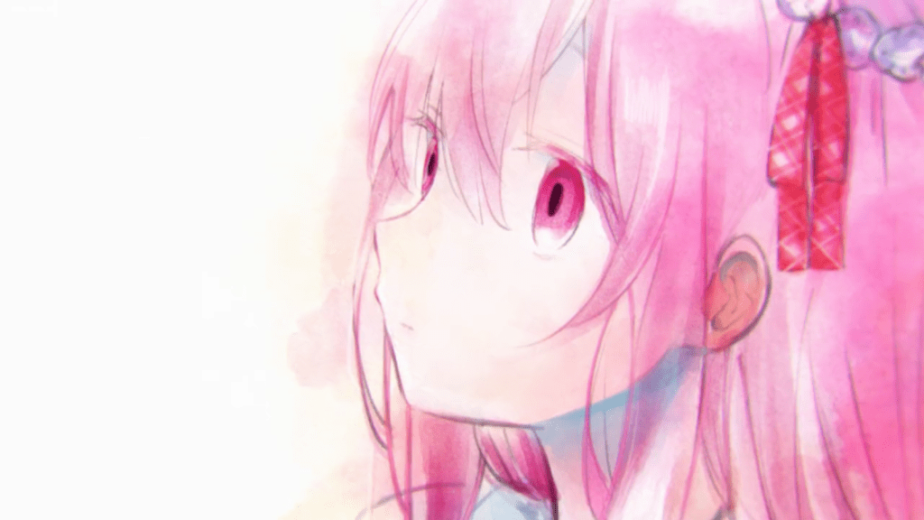 However, I would still rate the visuals as 7/10 due to a number of positive and impressive elements. The character designs are simple but not bad, especially for Shio, Satou, and Satou’s aunt. I enjoyed the visuals for the opening song with the mixture of happy imagery (candy, bright colors, etc.) and brief flashes of unsettling imagery (like inverted colors, a splash of blood, or the part where Shio is dancing between giant hands.) The glowing eyes on some shots are effective at being creepy and strange. When Satou is starting to lose her grip mentally, her pupils shrink and her eyes become red. I like this effect as well.
