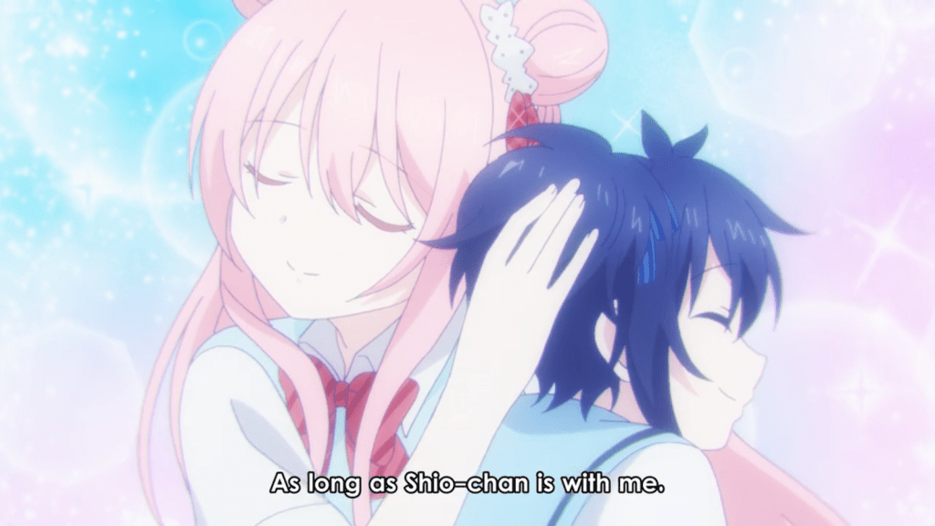 HSL doesn’t have particularly strong visual aspects. The art isn’t usually very detailed and the animation isn’t smooth. To me, the lighting and contrast never look quite right. I don’t like the way that characters are outlined with different colors rather than the obvious choice of black. For example, sometimes, Shio or Shoko would be drawn with blue linework. This technique can sometimes be used well, but it’s pretty rare. It looks sloppy and out of place in HSL. The face expressions are sometimes way over-the-top. However, there are also really good ones.