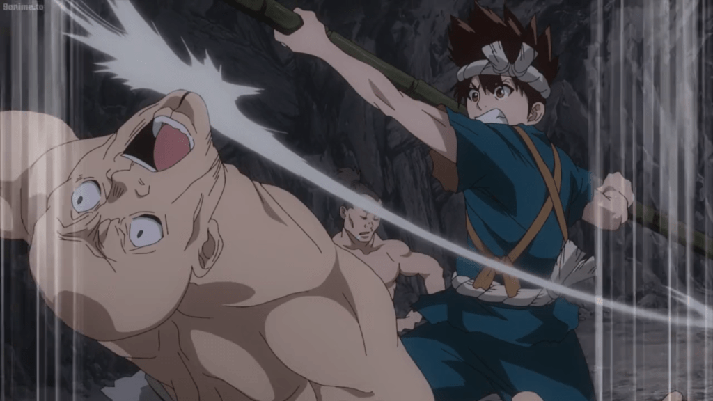 Over the course of this episode, Chrome tries to escape from the bamboo jail where he’s being held. Finally, he succeeds, using sodium hydroxide to melt the ropes holding together the bamboo beams. He made the chemical from his sweat and the electricity from a battery that Taiju and Yuzuriha passed to him. In this episode, we were also introduced to Yo, another one of Tsukasa’s awakened henchmen. Yo was a police officer until he shot an escaping criminal in the back and was fired. He’s pretty insane, but doesn’t seem too formidable compared to Hyouga. Chrome made it safely back to Senku’s camp.