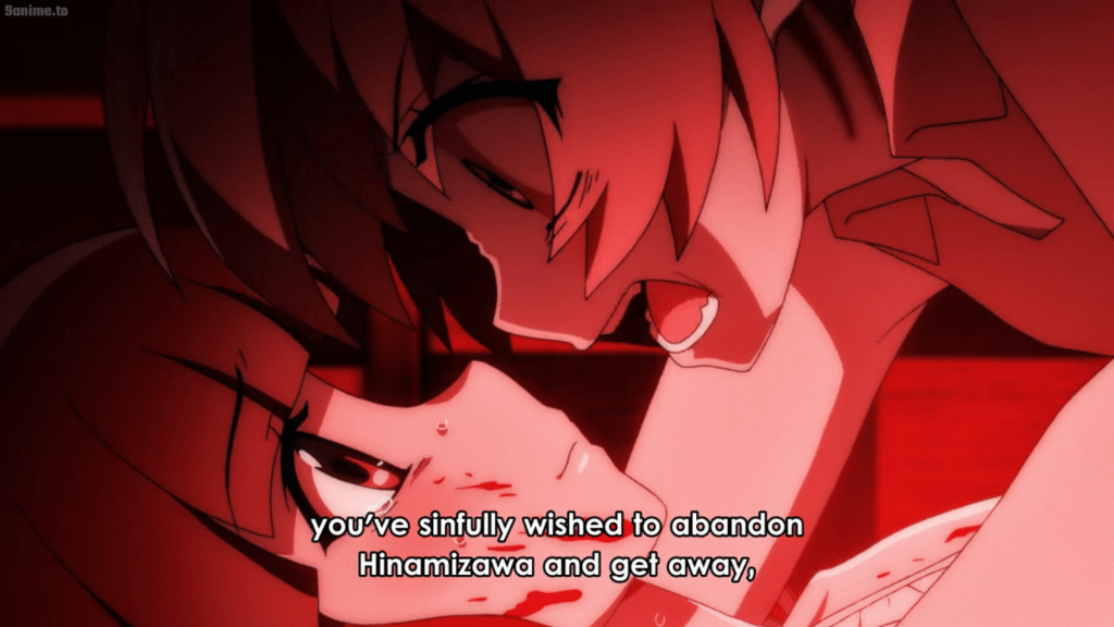 Now, this next issue might belong more to the character category, but I’m leaving it here. It seems thematically weak that Satoko went mad over things like school troubles and arguments with Rika. Those things still suck, but in the Higurashi world, that kind of suffering is insignificant. I think there should have been more powerful triggers for Satoko to become the villain. For example, there could have been worse abuse at the academy. However, this argument ultimately fails if we consider that Satoko was so fragile and unhinged to start with. Even if she doesn’t have Hinamizawa syndrome, she’s still predisposed to mental illness and emotional issues. It might not take very much to rock her world and drive her over the edge.