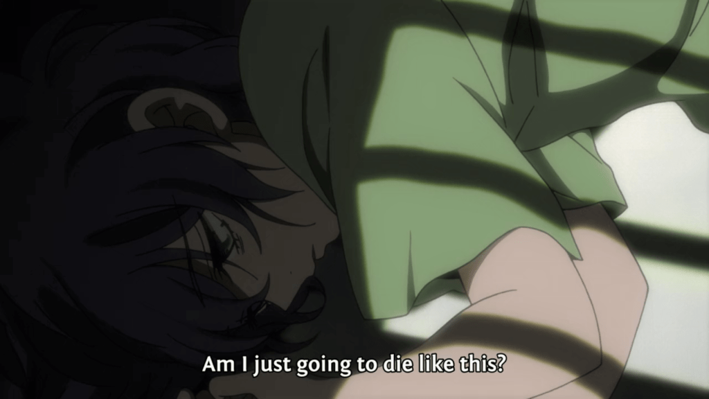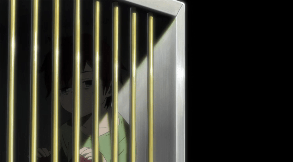 Since we now understand all that, let’s review what happened in the boxes scene and put it into perspective. At that time, Shouma and Kanba were suffering and slowly dying (at least metaphorically) as was their fate. They suffered from being inside societal “boxes,” in roles they could not escape. They suffered because theirs was the family that brought a curse on the world: the terror attacks on the subways.