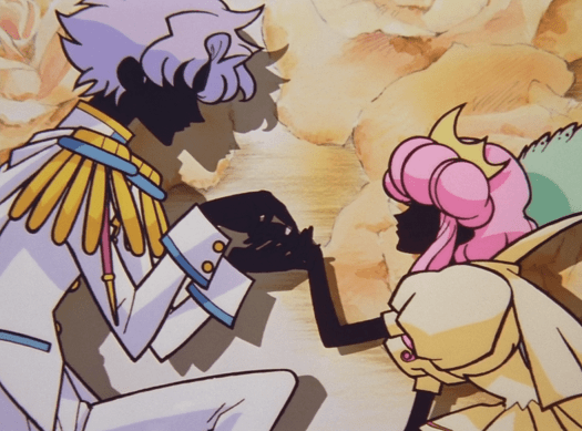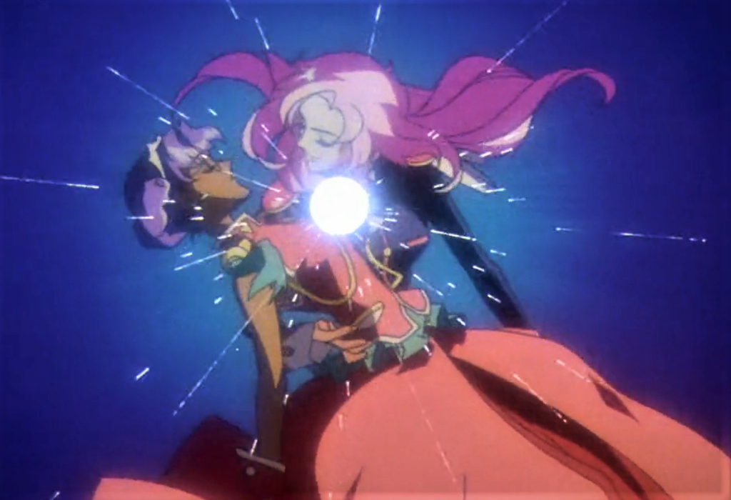 You may have noticed that a semi-transparent, princely figure comes down from the floating castle a few times and gives Utena special power. Perhaps you also noticed that Anthy refers to her abilities as “power of Dios that sleeps within me” and that the magical blade used by the dueling champion is called the Sword of Dios. Later arcs will tell us more about this mysterious figure– Prince Dios. For now, we only need to know that he is the source of great power in RGU lore, as well as being a symbol of the princely values that give Utena her noble strength.