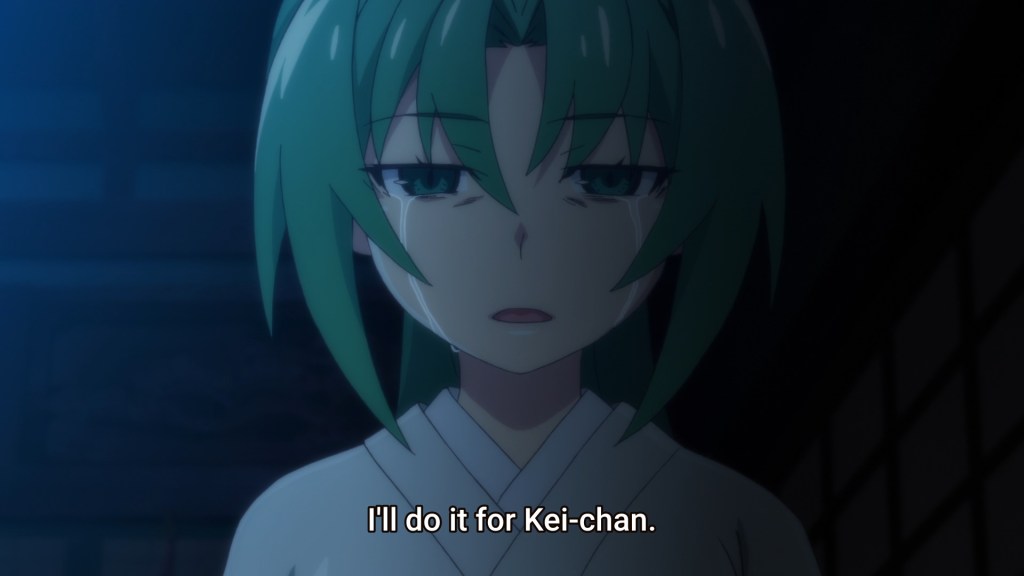 Satoko’s uncle Teppei was, in the first two Higurashi series, a true monster. He used mental, verbal, and physical abuse on Satoshi and Satoko. But once the world is put on a different path from the one Rika lived so many times, Teppei undergoes a change. He rejects his gangster life, tries to recover from addiction, and becomes loving and supportive to Satoko. It’s clear that he feels great remorse for being violent and intimidating in the past. I’m actually very surprised with how well the anime pulled this off. I thought I would always hate Teppei. But I was won over by seeing his best self as a fatherly figure, free from the old risky lifestyle and addictions. The redemption of Teppei was important for the resolution of Satoko’s story in the end, so I’m very glad it happened.