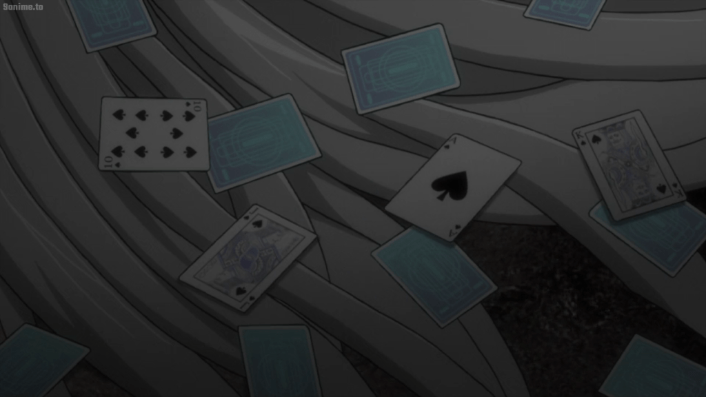 If you pay attention throughout the episode, you’ll notice that playing cards are a recurring visual motif. Early on, Pino was reading a picture book showing the card soldiers like from Alice in Wonderland. Later, when the soldiers of Charos are playing cards, Pino curiously investigates and asks if they are card soldiers. The theme of playing cards appears again when a deck is seen scattered over the remains of Senex Proxy. Kazkis examines the cards and turns over a joker, which seems to amuse him. So, does the theme of cards in episode 8 have any special meaning?