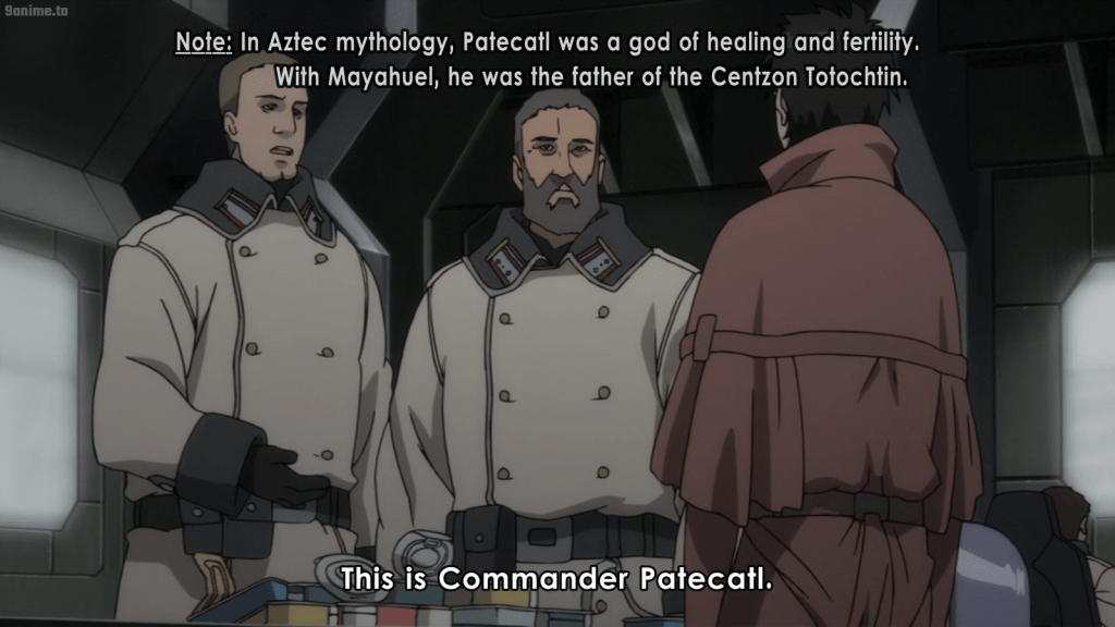 You may recall that Vincent’s ship is called the Centzon Totochtin meaning the 400 Rabbits. They call the ship “The Rabbit” or “The Centzon” for short. It’s a reference to the Aztec god of drunkenness and parties. Well, the Aztec references continue in this episode. The commander of the Charos soldiers is named Patecatl, which is also the name of an Aztec god of healing and fertility. Patecatl joined with the goddess Mayahuel and they were the parents of the Centzon Totochtin. Additionally, Patecatl’s administrative assistant is named Omacatl, which is the name of the Aztec god of feasts and happiness.