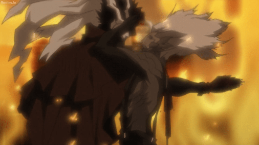 When Vincent still won’t accept the truth, Kazkis changes to his Proxy form: the Proxy of Brilliance. He begins to continuously hurt Vincent in a way that would have killed a normal human several times over. Eventually, Vincent is forced into his Proxy form to survive. He’s in shock as he realizes he is no longer himself, but a Proxy monster. The fighting continues between Kazkis and Ergo even while they talk to each other. Kazkis vows to avenge Senex. Ergo doesn’t want to fight or hurt anyone, but as he is beaten up, he sees a vision of Re-L. This puts him into some kind of berserk mode, and he fights with new strength and fervor. Eventually, Ergo wins, fatally wounding Kazkis while introducing himself as Ergo Proxy, the Proxy of Death. Kazkis allows himself to die in the spreading fire, but not without cursing Vincent and predicting his descent into eternal darkness.