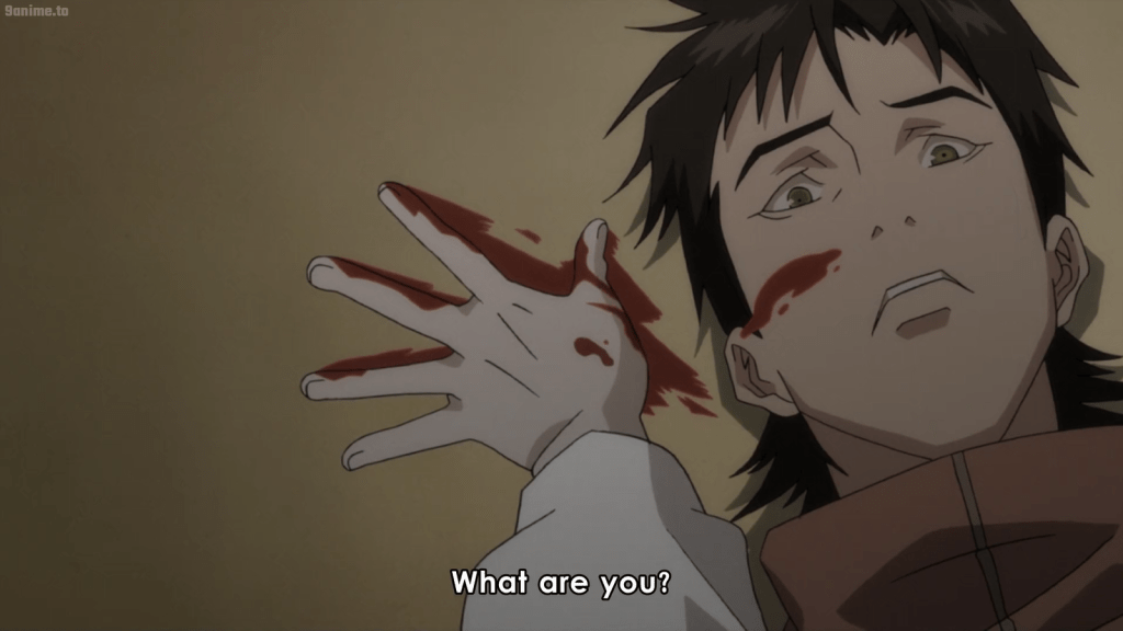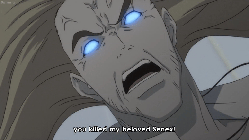 Though Vincent and Kazkis talk about the war and other things, it’s hard to make sense of what Kazkis is saying or thinking, especially when he says he was in love with Senex Proxy. Vincent listens to the tale of the love between Senex and Kazkis, but he still doesn’t understand what Kazkis is getting at: that he is a Proxy. Morever, he is a Proxy who is similar to Vincent, because he had a human form and identity. Although he had loved Senex, Kazkis holds no ill will against her killer (Vincent), because he has also now fallen in love with him. Upon being accused of killing Senex, Vincent objects and begins panicking. He still won’t accept the truth of what he is.