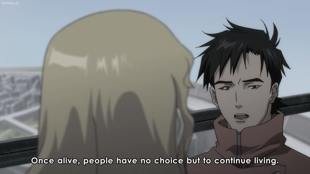 Later on in the battle, Kazkis asks why Vincent is still alive. He’s lost his memories and turned away from his proxy purpose. He’s lost Monad, his proxy lover, and he kills or causes death to others wherever he goes. So why is Ergo/Vincent still fighting to live? Like he said earlier, living things have no choice but to try to keep living. Even those who are suicidal must battle a survival instinct that gets in the way (I know from experience). Living things want to live. That’s reason enough if you ask me, but Vincent also has something else in particular motivating him: his fondness for Re-L. Having someone you hope to see again someday can be a great motivator to keep fighting. It’s just one more example of the persistence of life.