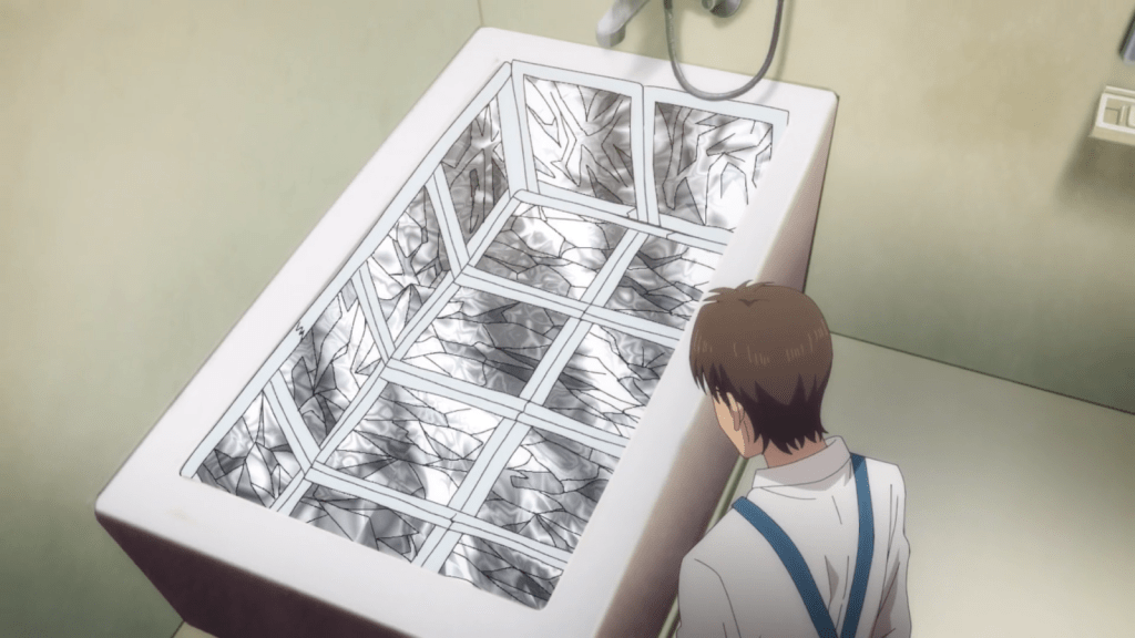 Tetsuo disguises as a cleaning service employee and succeeds in fooling the yakuza agent, who then leaves the apartment. Now, Tetsuo must figure out how to deal with Nobuto’s corpse. For the entire episode, he and his family are being monitored by the yakuza, making the task much more difficult. Tetsuo cooks the body down to mere meat and bones in the bathtub, thus reducing the mass of the corpse and the space it will take up. The cooked remains fit into a suitcase. The next day, at home, Tetsuo puts the body scraps in a large pot with moist dirt and a powerful chemical decomposer used for composting. Within a few days, the meat and bones will dissolve and become soil.