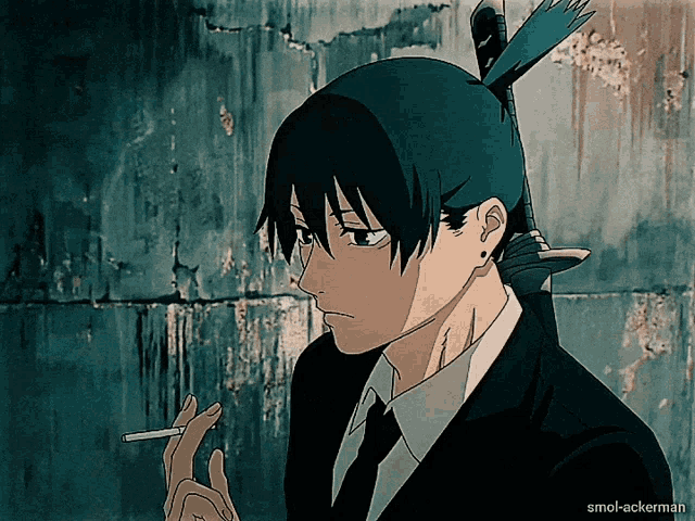 Now, what about Aki and cigarettes? Himeno often tried to get Aki to smoke, but for the first few years, he always refused. His reason was that they were unhealthy. Plus, when he started working as a devil hunter, he wasn’t yet eighteen. But at some point – exactly when is unknown – he must have finally given in. At the time of the series, Aki is nineteen years old and is seen smoking several times. He buys the same brand as Himeno, but seems to smoke less often than her, and doesn’t always carry them around. It’s clear that he associates cigarettes with Himeno.