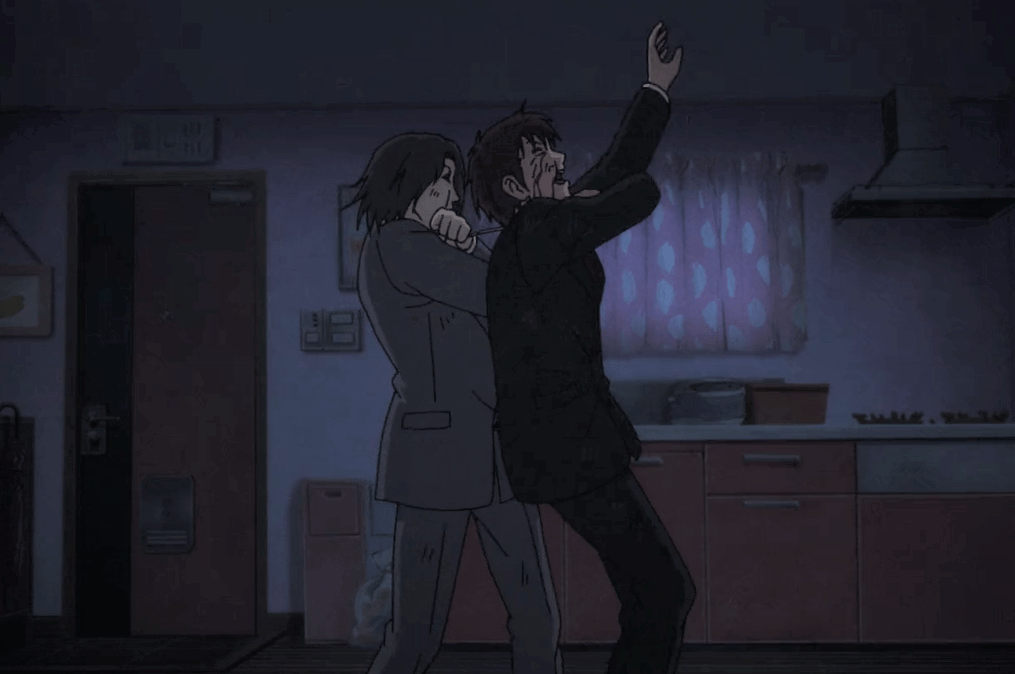 Tetsuo is finally able to throw Matori off him. Matori grabs a large kitchen knife, but instead of attacking Tetsuo, he stabs himself. When Tetsuo asks why, Matori says he will understand when he loses his family. Basically, he gave up and died. But he also intended for Tetsuo to take the blame for killing him. The police come to the door about the noise complaint. While covering Matori’s mouth as he dies, Tetsuo lies to the cops with a ridiculous story. For some strange reason, the police believe him and leave without opening the door.