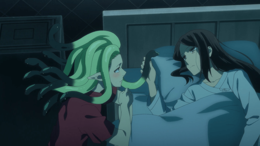 Before long, Lucy wakes up to a visit from Zoe, who allows her to pet the snakes in his hair. As someone who used to keep spiders, Lucy loves animals that most people fear. The next day is Halloween. Lucy is supposed to go to the mysterious underground waste tower to collect herbs and gems. She’s doing it for the money. But Chise, Zoe, and the other friends make Lucy stay behind since she is unwell. They go in her place, not realizing exactly how dangerous this mission might be.