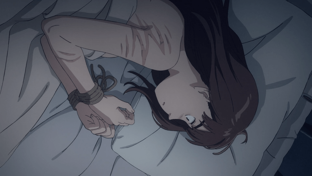 Next, let’s look at what happened with Kiruko. Trapped in Robin’s room, Kiruko is psychologically scarred and questioning his identity. He wonders if he is becoming his sister Kiriko. Just then, Maru arrives at the filtration plant. He busted his way in by force after Kiruko didn’t return for two days. When he sees Kiruko tied up and crying, naked, Maru’s quiet rage is obvious. He promptly leaves the room, finds Robin, and corners him. Then he beats the man half to death, continuing to bludgeon his head with his fist even after Robin loses consciousness.