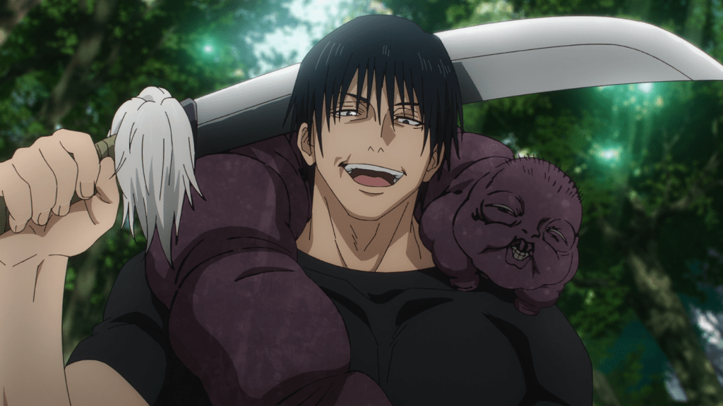 It doesn’t take long for Satoru to defeat Toji. He combines his blue orb (the power to attract) with his red orb (the power to repel), thereby creating the purple orb of elimination. The blast from the purple orb blew a huge hole in Toji’s side. As he died, Toji told Satoru that his son, Megumi, would be sold to the Zenin clan in 3 years. We know from the first season that Satoru chose Megumi as one of his students. In a weird way, Megumi’s father did something good for him, I suppose.