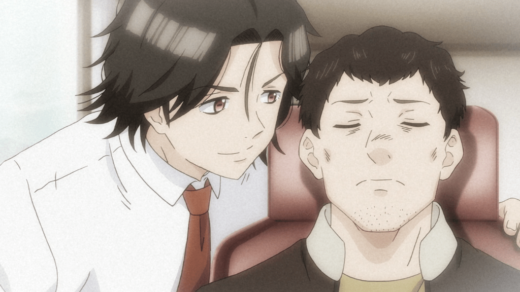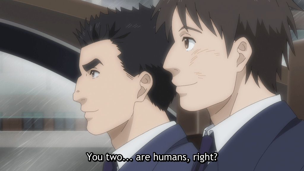 The secondary story of the episode was about a Humanoid named Matsumura with a long history of reckless actions, low-grade crime, and addiction. He goes to see a “Life Planner” by the name of Seto, asking him if he can cure his addiction to alcohol. Seto employs a controversial, under-the-table treatment to do this. He essentially puts Matsumura into a hypnotic state and instills false memories of an “Old Friend” who keeps him on the right track. The treatment was a success and Matsumura stopped his crime and drinking, instead donating money regularly to his “Old Friend.”